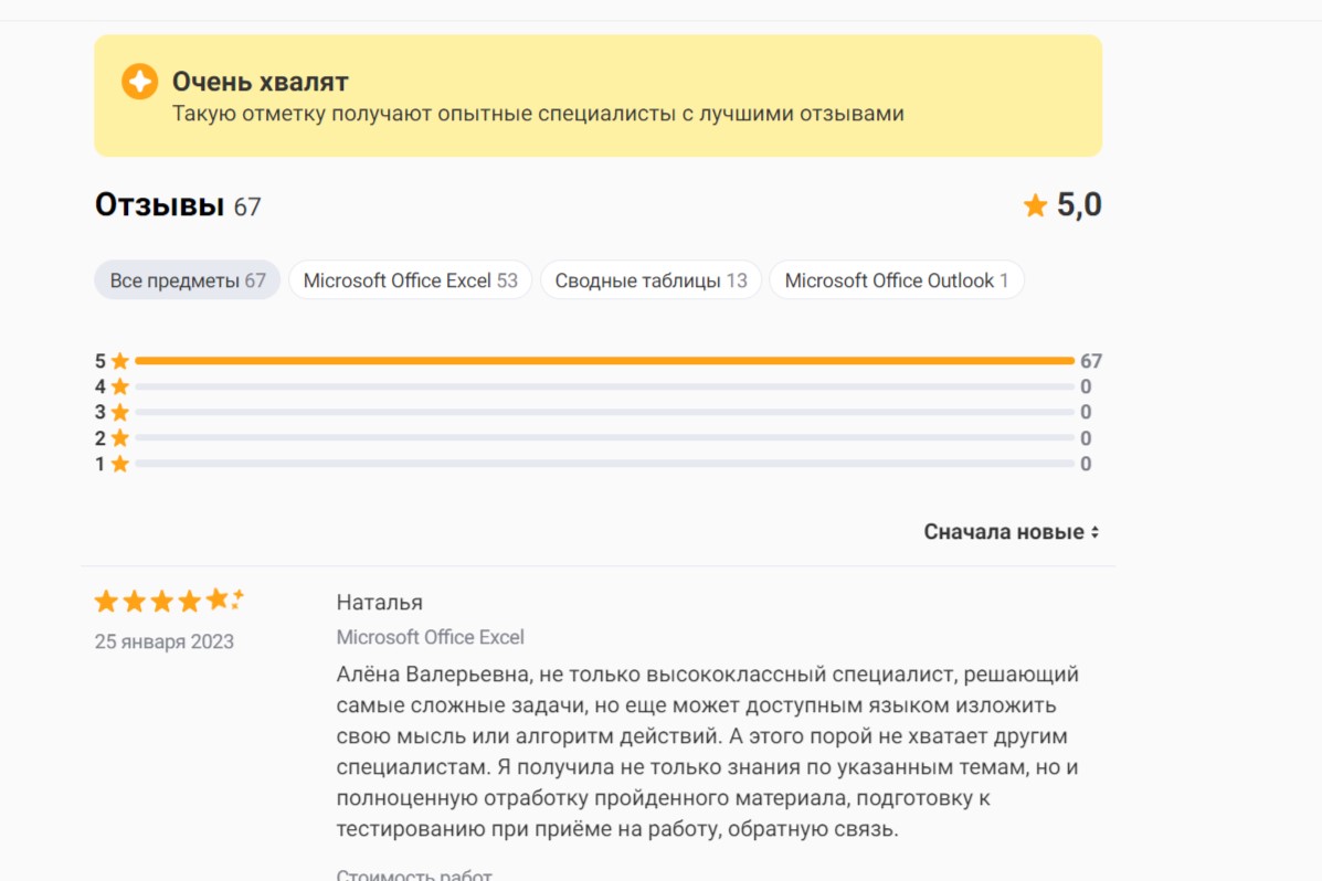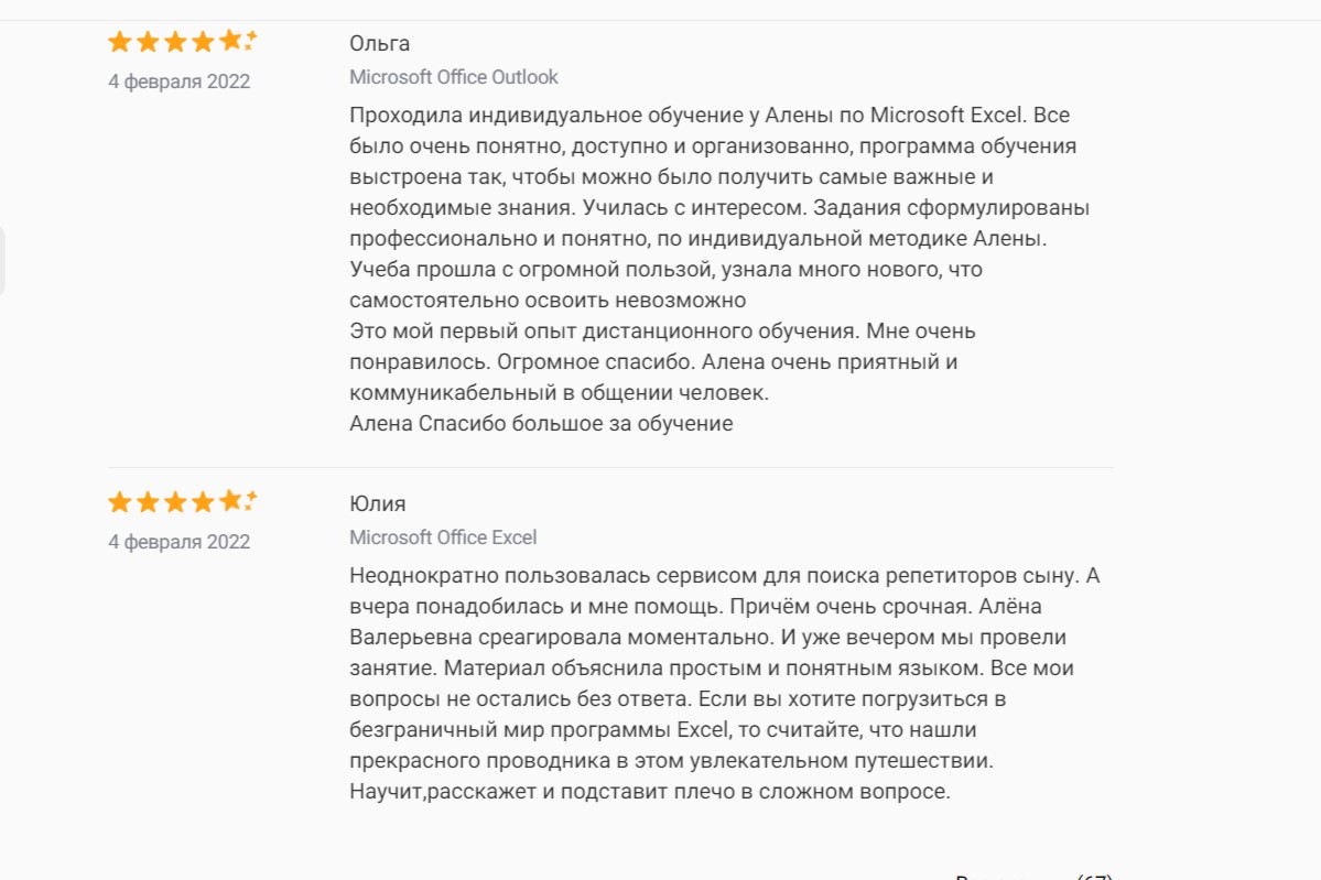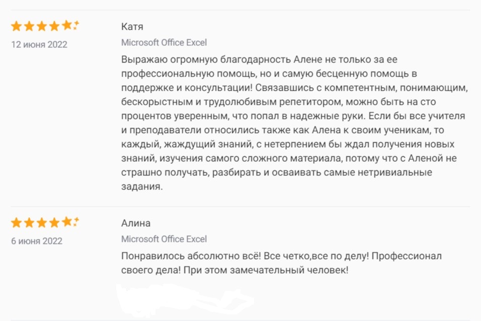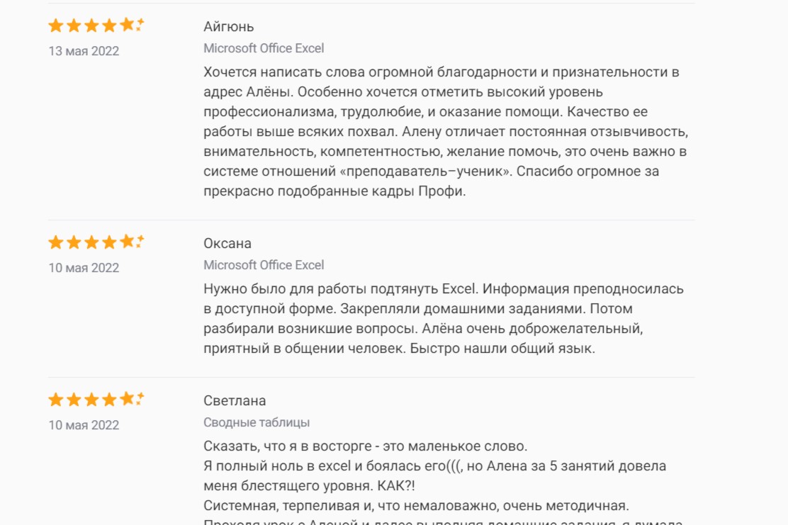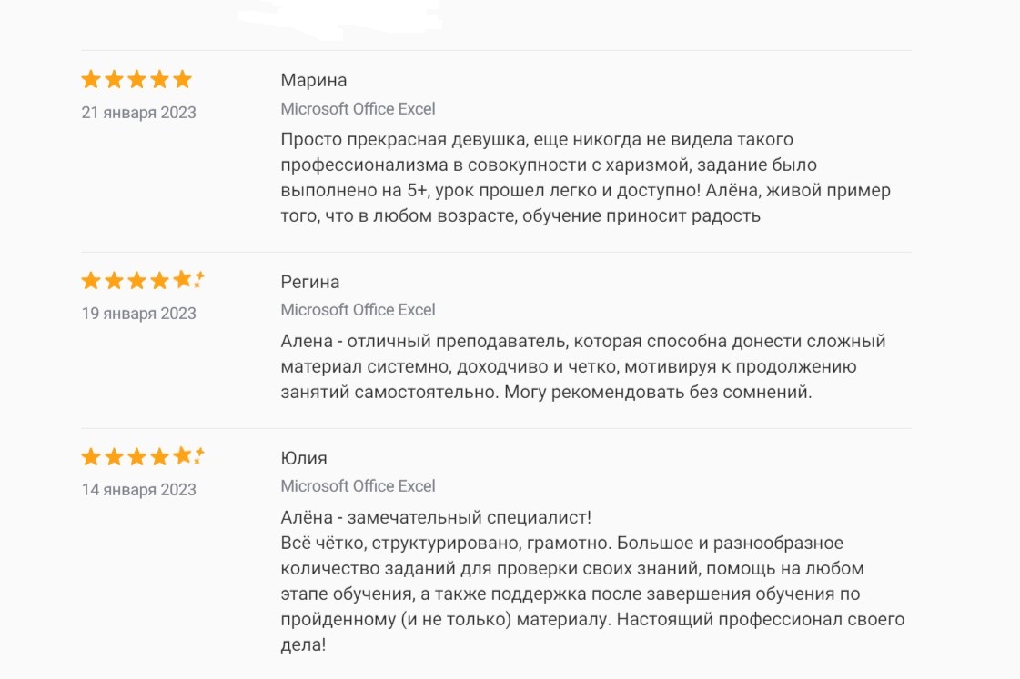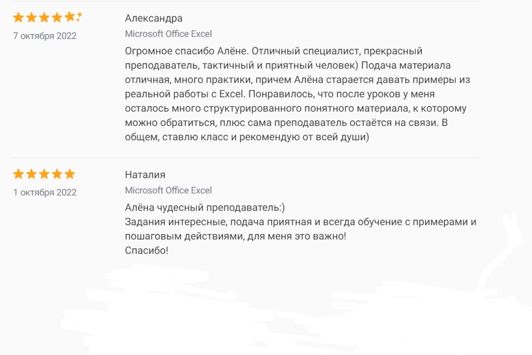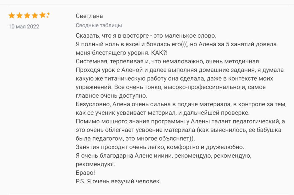 Меня зовут Алёна. Более 10 лет я работаю в иностранных банках финансовым аналитиком. Провожу тренинги по работе с Microsoft Excel (на русском и английском языках) для сотрудников и не представляю жизни без Excel, разработала свою программу и делюсь знаниями в логичном и структурированном порядке.